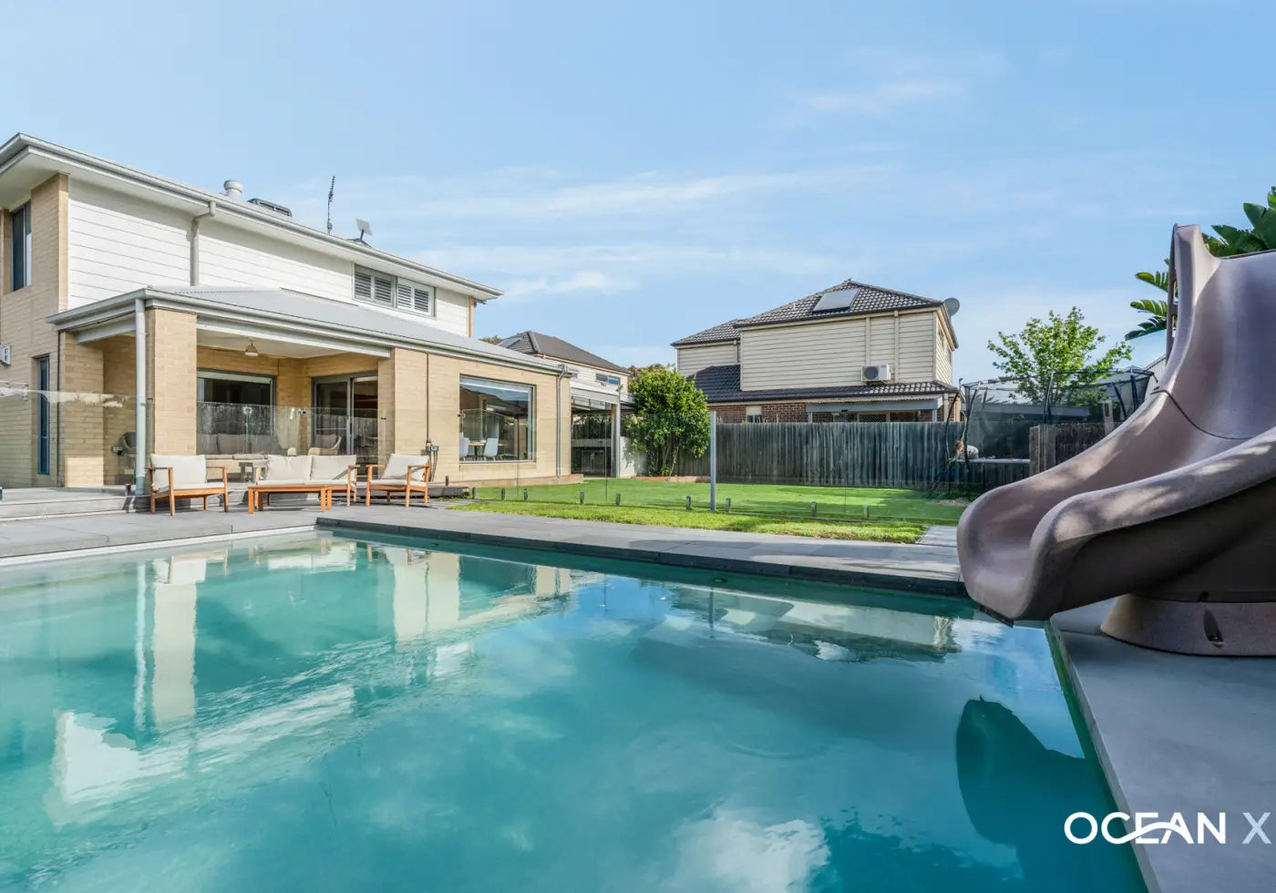 Heated swimming pool with slide, accompanied by a private entertainers’ area plus an additional alfresco for dining and lounging